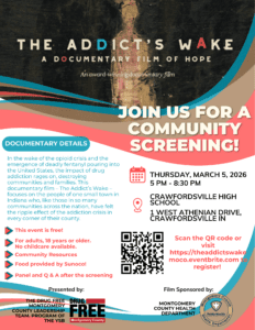 Drug Free Montgomery County invites the public for a free screening of The Addict’s Wake, an independently made documentary about the struggles of battling addiction. It will be held at Crawfordsville High School on Thursday, March 5th from 5 until 8:30 p.m.