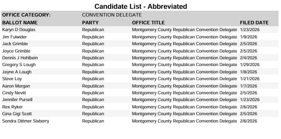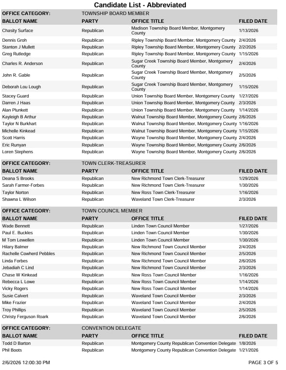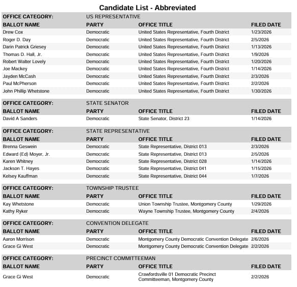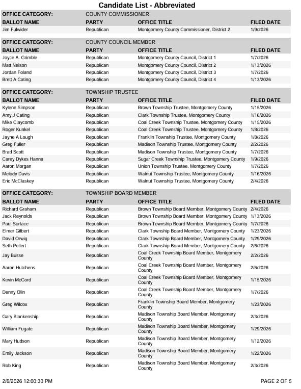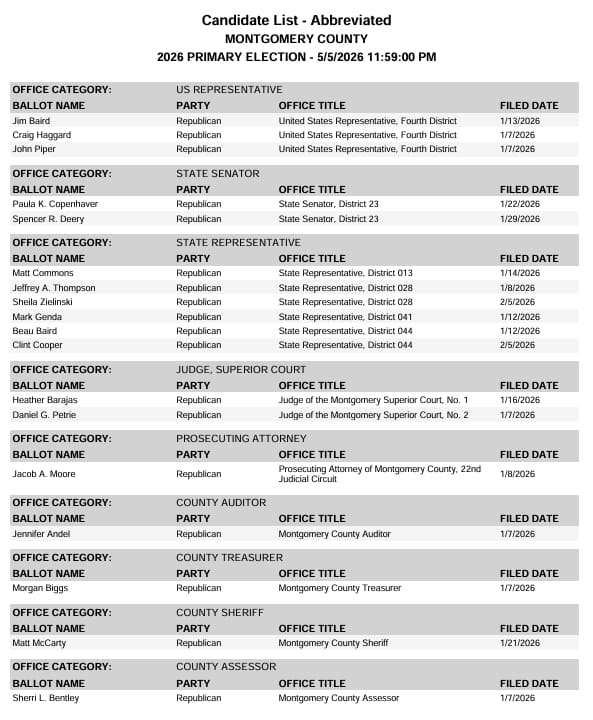 The Montgomery County Clerk’s Office released the complete list of declared candidates for the local 2026 midterm elections Friday. There are dozens of different district, county, city, and township offices up for grabs this season. Primaries for the State of Indiana will begin on Tuesday, May 5th. Voter registration closes on Monday, April 6th. Learn more about local elections on the Clerk’s Office website by clicking or tapping here.