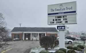 A sign is posted on the front of the Fountain Trust bank regarding the stolen ATM machine. | Photo credit: Kurtis Broadstreet.