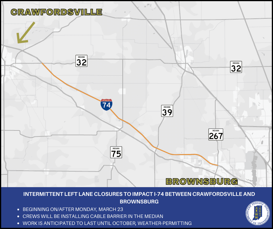 The Indiana Department of Transportation (INDOT) announced intermittent left lane closures on Interstate 74 between Crawfordsville and Brownsburg. Beginning on or after March 23, workers are going to install a cable barrier in the median between State Road 32 and State Road 267. It’ll stretch across 27 miles, but work will only happen in one direction at a time for up to three miles.