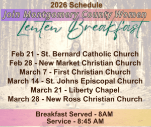 Montgomery County Women will serve breakfast meals at various churches during Lent. The season will begin on Ash Wednesday, which will be on February 18th this year. Each breakfast will begin serving at 8 a.m., with a service following at 8:45. Below is the complete schedule: