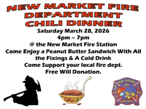 The New Market Volunteer Fire Department invites the community to its chili dinner on Saturday, March 28. It’ll be held from 4 until 7 p.m. in the New Market Fire Station at 201 W. Main Street. Meals come with a peanut butter sandwich and a cold drink. Free will donations accepted.